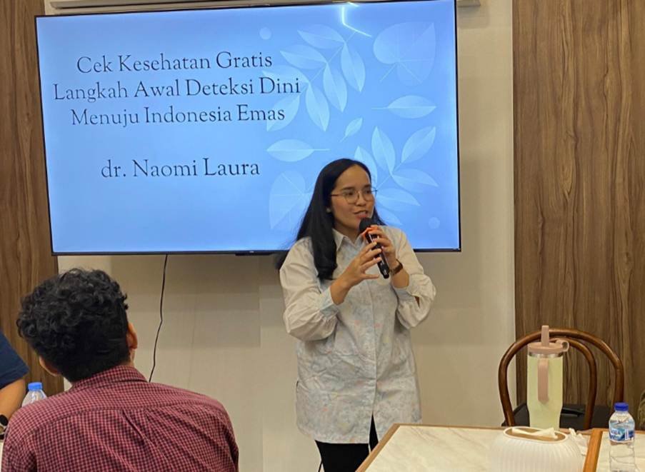 Dalam paparannya, dr. Naomi menjelaskan bahwa penyakit tidak menular sering kali muncul tanpa gejala dan baru disadari ketika sudah memasuki tahap serius. Oleh karena itu, program CKG hadir sebagai langkah strategis untuk membangun kesadaran masyarakat terhadap pentingnya program cek kesehatan secara rutin untuk mendukung terciptanya generasi Indonesia Emas yang sehat, tangguh, dan produktif